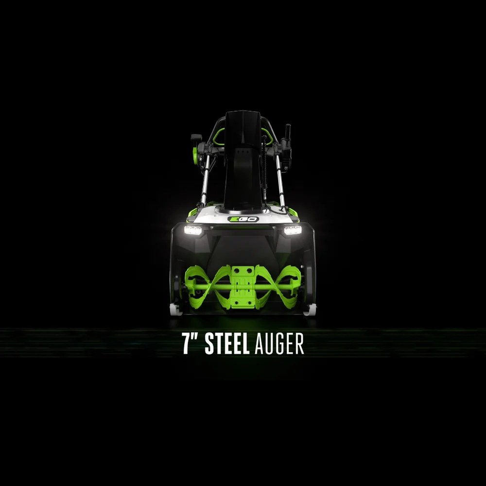 The EGO POWER+ 21” Single-Stage Snow Blower with Peak Power™ delivers the power and performance of gas-powered snow blowers without the noise, fuss, and fumes. Featuring Peak Power™ technology, this cordless snow blower combines the power of any two EGO 56V ARC Lithium™ batteries for the performance to clear even the heaviest, wettest snow with a throwing distance up to 45 feet. Built with a high-efficiency brushless motor and steel auger, this cordless electric snow blower handles what the city snowplow leaves behind with ease, cutting through ice and snow with up to 50% more power than SNT2110. Conveniently adjust the pitch and direction of where snow is thrown from the handle-mounted chute controls. Heated handle grips help keep your hands warm in the coldest, snowiest conditions. Clear up to a 14-car driveway with 8 inches of snow on a single charge with two recommended 6.0Ah ARC Lithium™ batteries. Experience Power Beyond Belief™ with the EGO POWER+ 21” Single-Stage Snow Blower and the entire EGO POWER+ lineup.